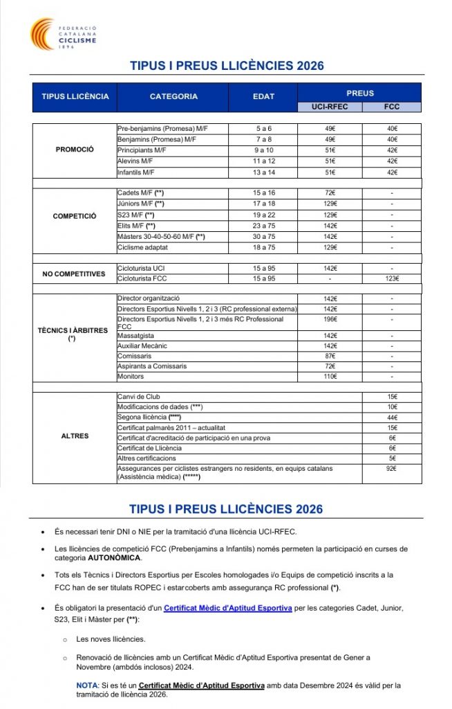 Ja es troba operativa la campanya de llicències de la Federació Catalana de Ciclisme per la propera temporada 2026.